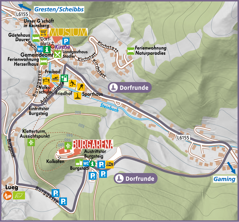 Die Dorfrunde startet am DORFPLATZ beim Musium. Der Weg führt vorbei an Spielplatz, Sportplatz, Schwimmbad, Friedhof und der Kulturvolksschule. Beim Bio-Bauernhof LUEG , wo köstliche Produkte aus Schafmilch erhältlich sind, beginnt der Anstieg zum Burgsattel. Ein liebevoll gestalteter Platz vor dem BURGSTADL lädt zu einer Rast ein – ein Getränkeautomat mit regionalen Produkten sowie ein WC sind vorhanden. Bergab geht es auf einem Waldweg in die Buchbergsiedlung. Von dort führt der Weg talauswärts zurück ins Dorf bis zum MUSIUM, dem weit über Reinsberg hinaus bekannten Veranstaltungszentrum am Dorfplatz. Ein weiterer Tipp ist ein Spaziergang vom Dorfzentrum in die sonnige Kirchstatt, von wo sich ein einzigartiger Blick auf die Burgarena und das Kulturdorf eröffnet.