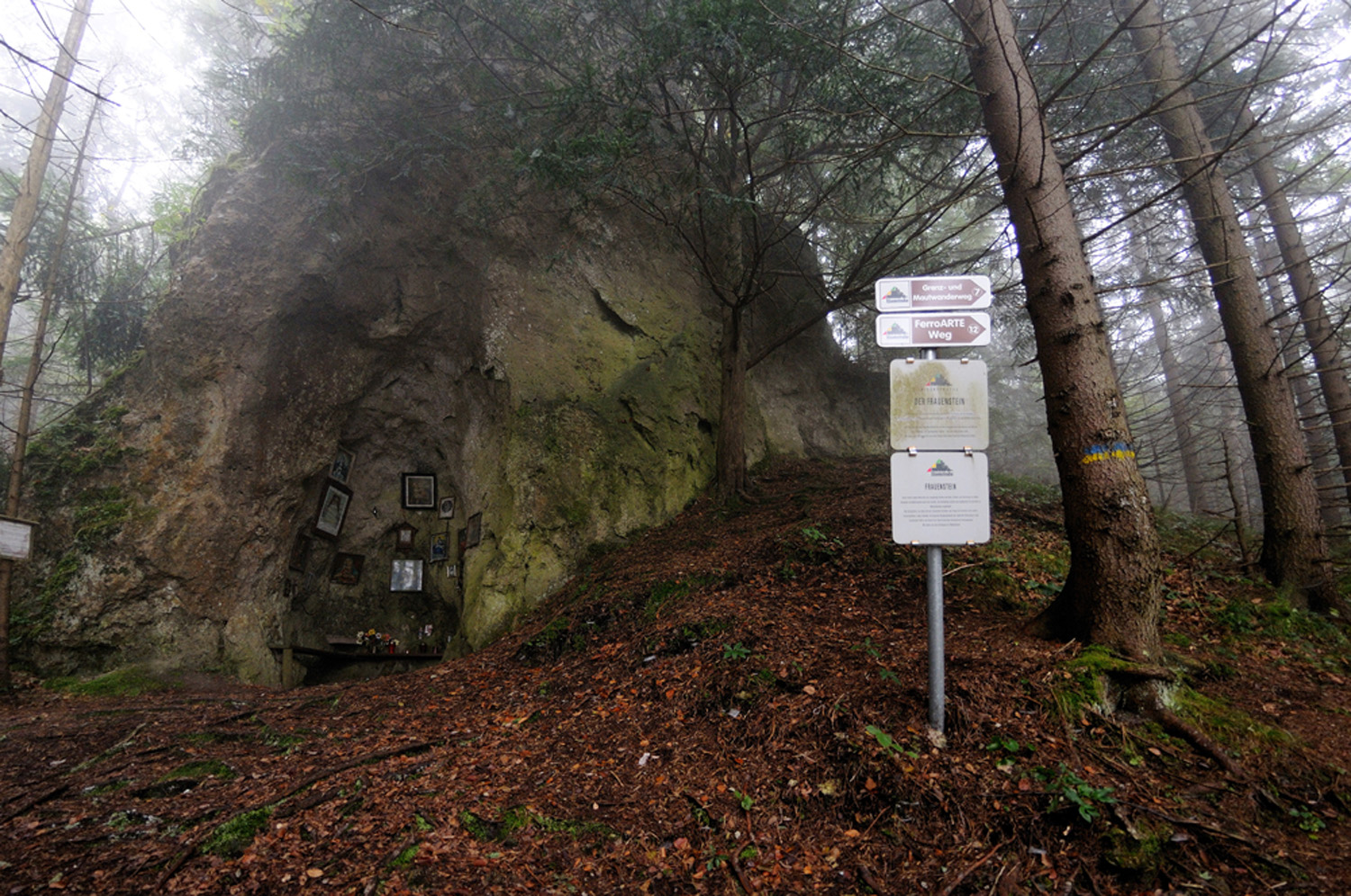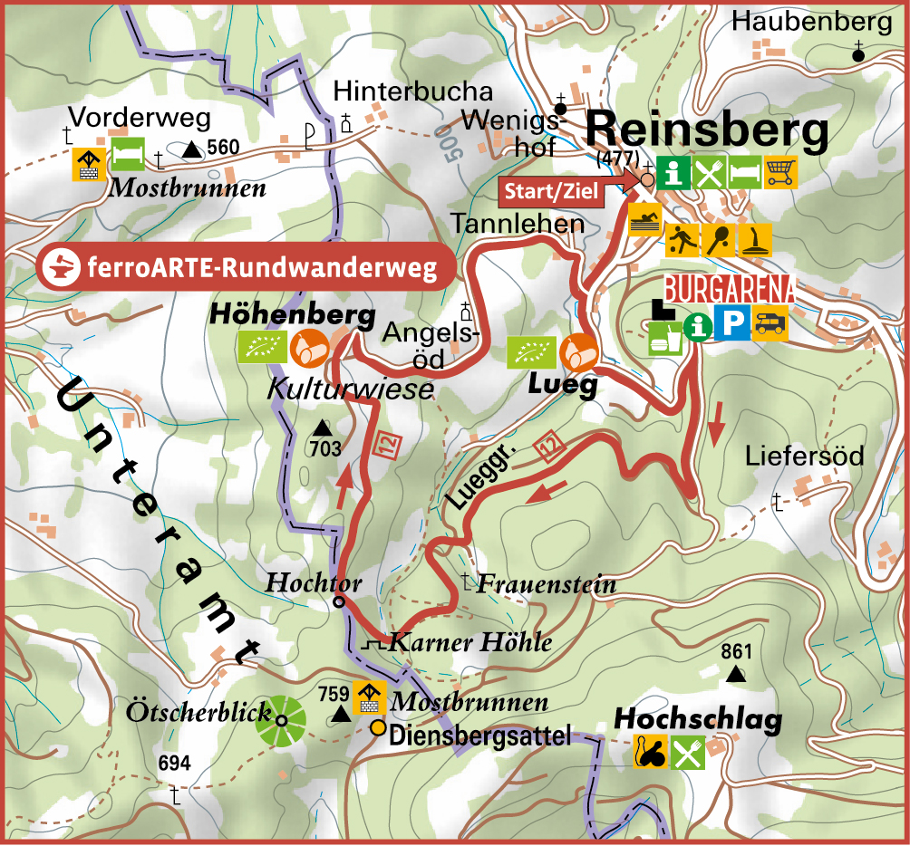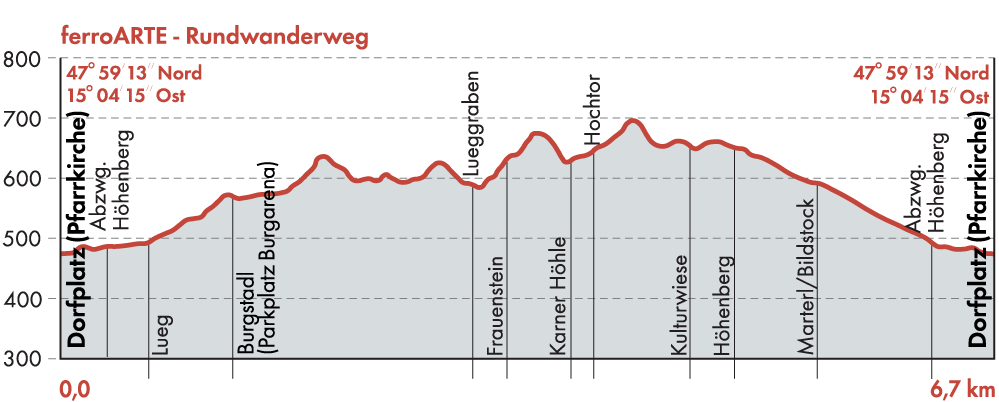 Dorfplatz (Pfarrkirche) – Lueg – Burgstadl (Parkplatz Burgarena) – Lueggraben – Frauenstein – Karner-Höhle – Hochtor – Kulturwiese – Höhenberg – Marterl/Bildstock – Burggasse – Dorfplatz