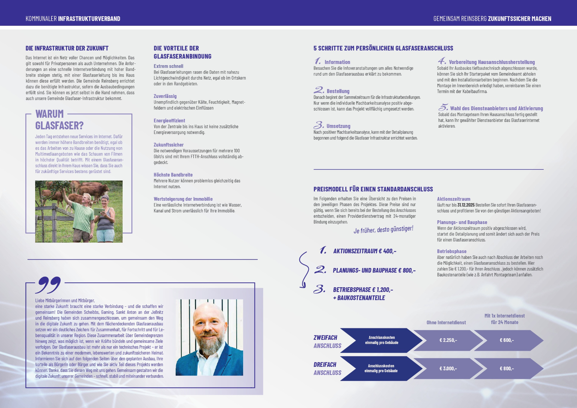 Schnelles Internet für zuhause ist eines der Themen der Zukunft und ist nun auch in Reinsberg angekommen. Ab dem Frühjahr 2026 soll das Netz in ganz Reinsberg in Zusammenarbeit mit Scheibbs, Gaming und St. Anton ausgebaut werden.