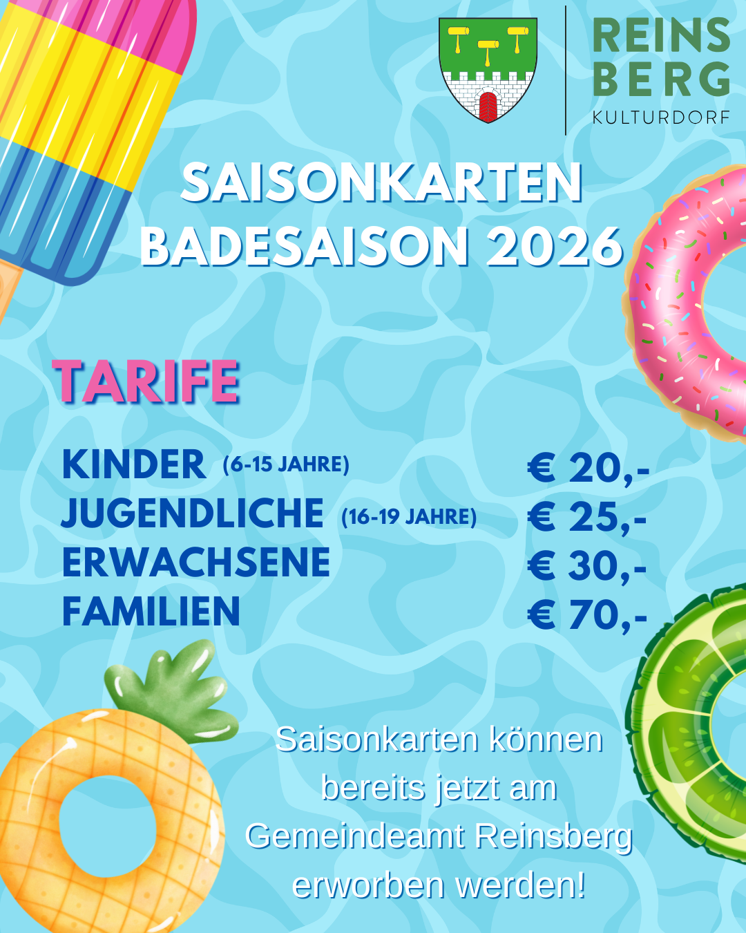 Saisonkarten für die Badesaison 2026 Donnerstag, 19. März 2026 Rechtzeitig für das Osternest können bereits jetzt die Saisonkarten für das Reinsberger Freibad am Gemeindeamt erworben werden. Teile den Artikel ⇐ zurück