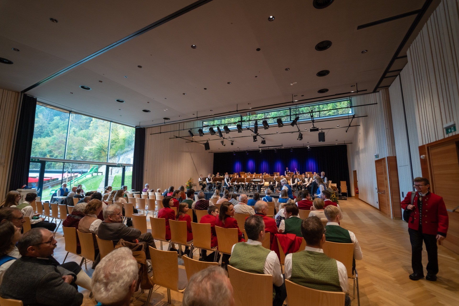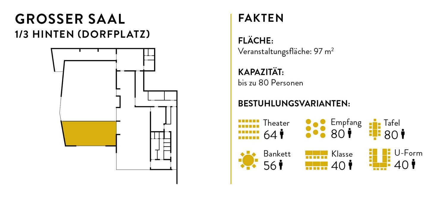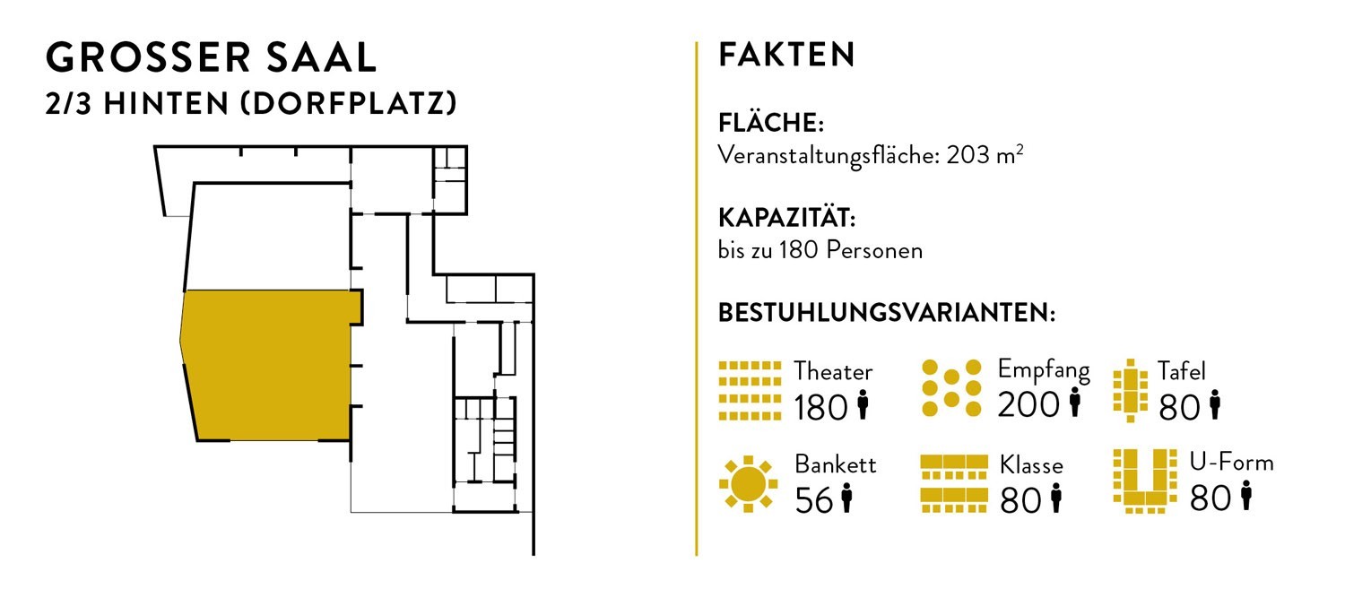 Durch den direkten Ausgang in einen überdachten Außenbereich und den schönen Dorfplatz bietet der Saal ein großzügiges Foyer, das Ihre Veranstaltung zusätzlich aufwertet.