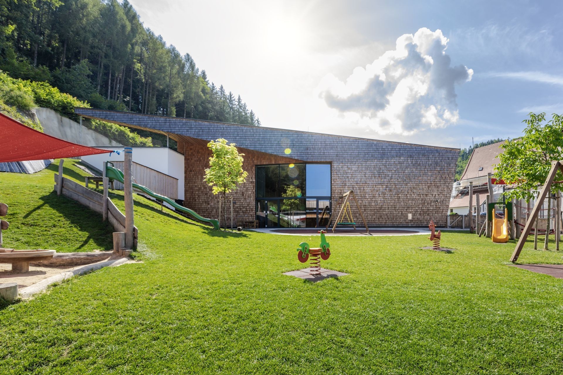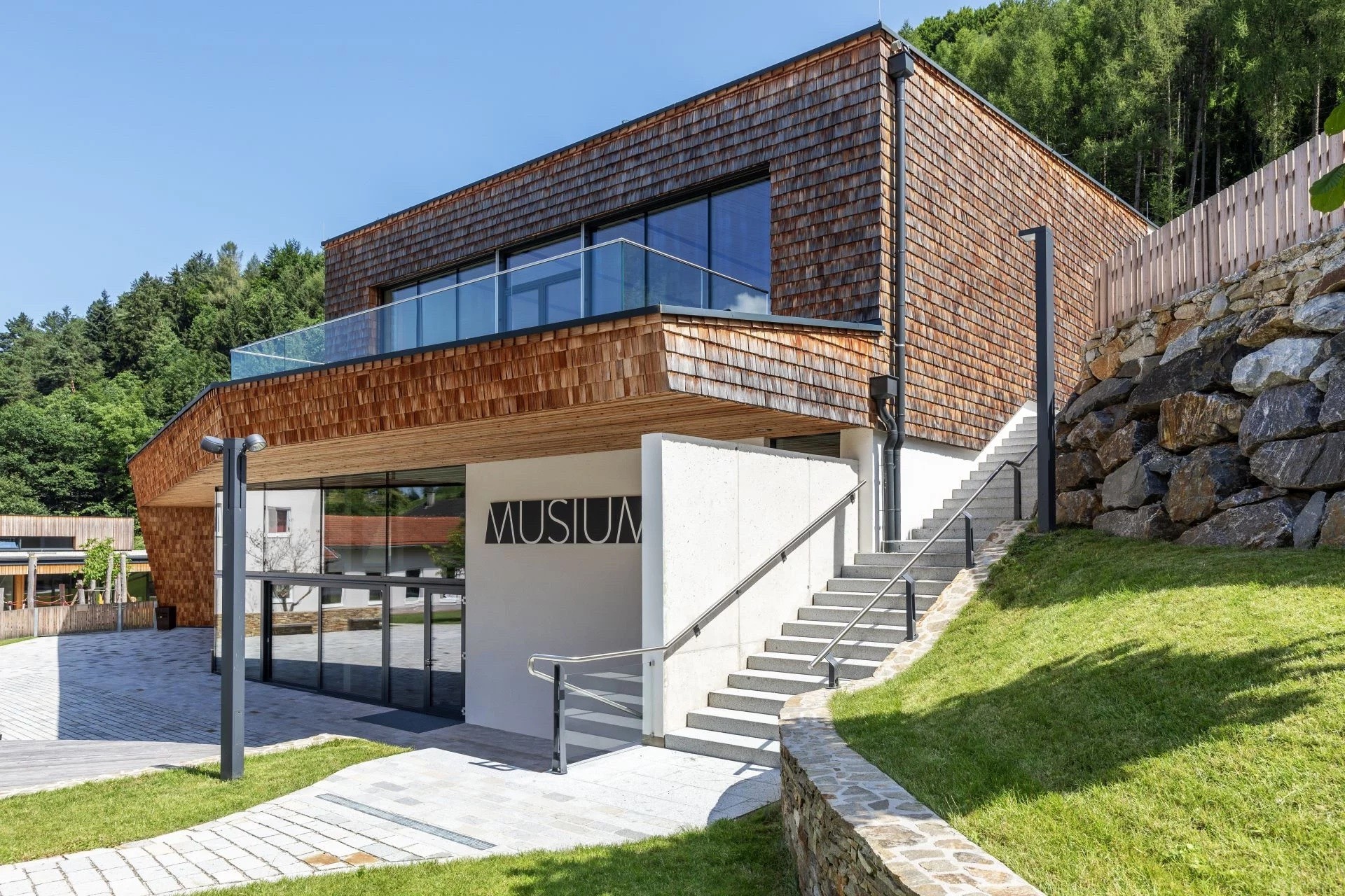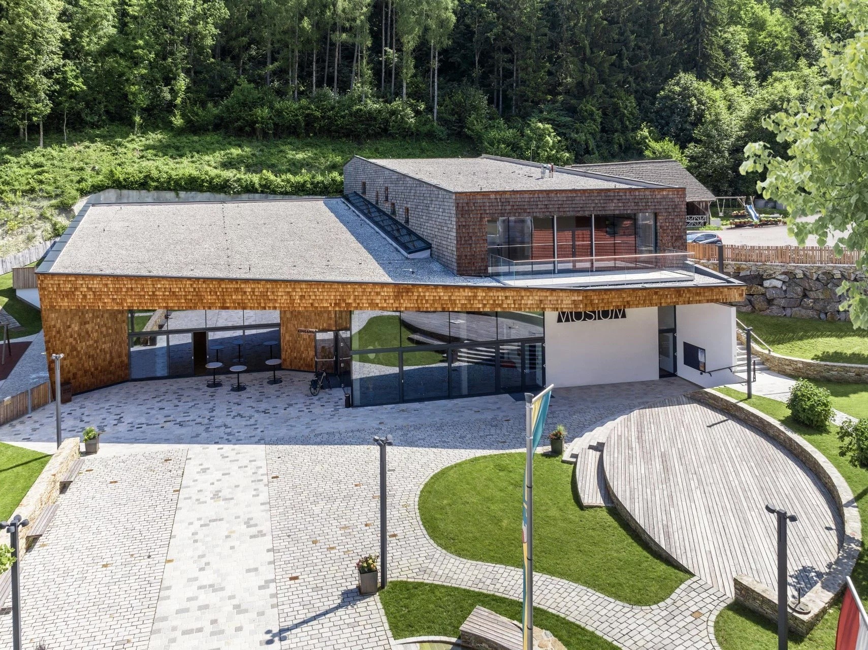 Die besondere Architektur des MUSIUMS – einharmonischer Mix aus offenen Glasflächen und heimeligen Schindelfronten – schafft eine einladende Atmosphäre und ermöglicht dem Gast einen freien Blick auf die umliegende Natur und das bunte Dorfgeschehen.LEBENDIGER MITTELPUNKT DES DORFES