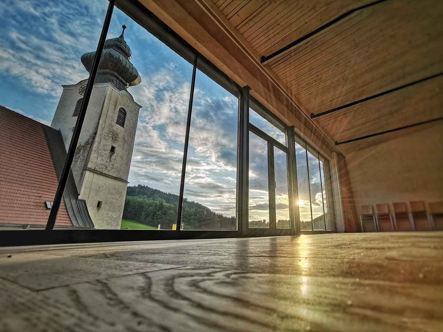 Der Panoramasaal im Obergeschoss unseres Hauses besticht durch seine lichtdurchflutete Atmosphäre und seinen offenen Charakter. Die großzügige Terrasse bietet einen atemberaubenden Blick über den Dorfplatz und lädt zum Verweilen ein.